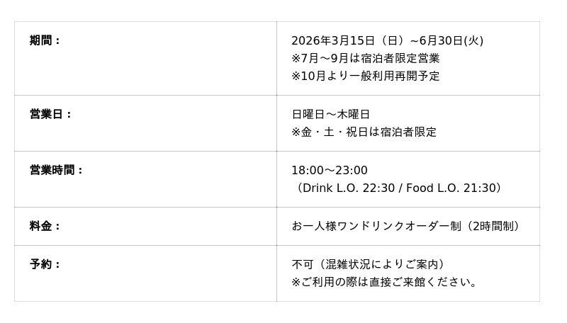 なお、7月から9月の夏季期間は宿泊者限定での営業となり、一般のお客様のご利用は10月より再開予定です。