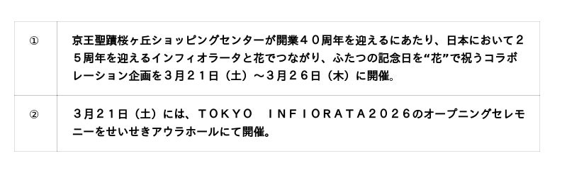 株式会社京王SCクリエイション(本社:東京都渋谷区、代表取締役社長:小堺 健司)は、2026年3月28日(土)に京王聖蹟桜ヶ丘ショッピングセンターが開業40周年を迎えるにあたり、日本において25周年を迎えるインフィオラータと花でつながり、ふたつの記念日を"花"で祝うコラボレーション企画(以下、当企画)を3月21日(土)~3月26日(木)の期間、A館6階アウラホールで開催いたします。