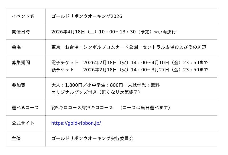 【ゴールドリボンウオーキングとは】ゴールドリボンウオーキングは2007年東京からスタートした小児がんの子どもたちとそのご家族を応援するチャリティイベントです。小児がん支援のシンボルマークである"ゴールドリボン"の存在を知っていただき、小児がんという病気を理解していただくキッカケになるべく、たくさんの参加者とゴールドリボンのグッズを身につけたウォーキングでその存在を伝えています。これまでに、東京・大阪・福岡・京都で開催し、のべ63,000人以上が参加・支援しています。