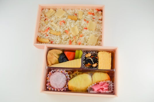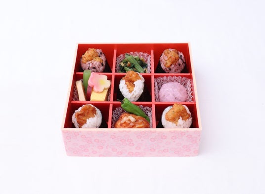 桜の花の塩漬けをのせたおにぎりとだしをきかせた関西風のだし巻き玉子の弁当。