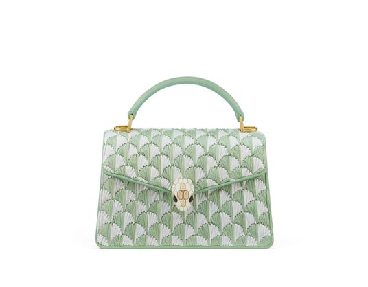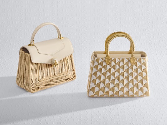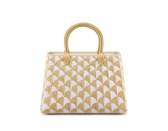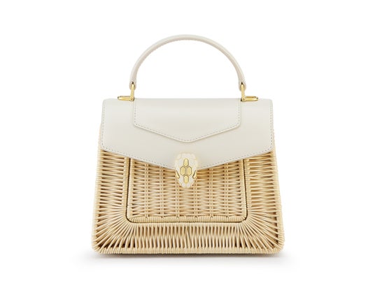 季節の素材をブルガリならではの卓越した技術で追求したウィーブン ウィッカーの技法は、時代を超えた「セルペンティ フォーエバー」トップハンドルに夏らしい爽やかさを添えます。柔らかく加工され金属フレームに編み込まれた天然ラタンが上質なアイボリーオパールカラーのカーフレザーと、象徴的な宝石にインスパイアされたスネークヘッドクロージャーと優美に組み合わされています。