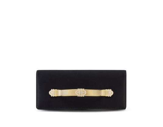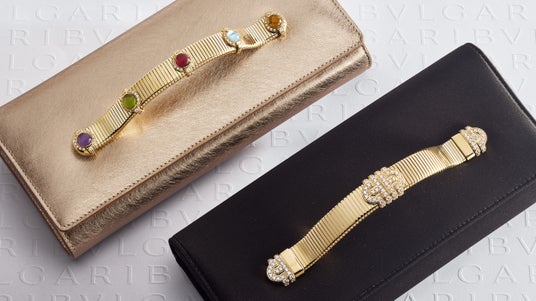 ジュエリーとレザーグッズの対話は、新しい「トゥボガス」クラッチで続き、そのハンドルはメゾンの伝説的な金細工のシグネチャーの一つを再現しています。トゥボガスというこの前衛的な技術は、1940年代以来、ブルガリの大胆なデザインを特徴づけてきました。ブラックサテンで発表される「トゥボガス パレンテシ」クラッチは、88個のジルコニアストーンで装飾されたパレンテシモチーフが施された象徴的なハンドルが特徴です。