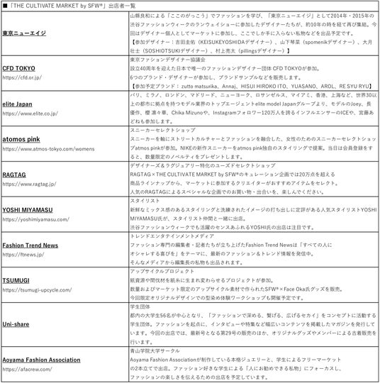 今春の新しい試みの1つとして、渋谷ファッションウィークとして初となるマーケット「THE CULTIVATE MARKET by SFW(R)」を渋谷サクラステージで開催します。「コミュニティを交ぜる」というこの新しいマーケットには、渋谷ファッションウィークがこれまでの13年の歴史で積み重ねてきたネットワークをベースに、ファッションデザイナーやインフルエンサー、スタイリスト、ブランド、学生サークルなど、ファッションを中心とした多彩な顔ぶれが出店予定。SNSでの情報発信にもご注目ください。