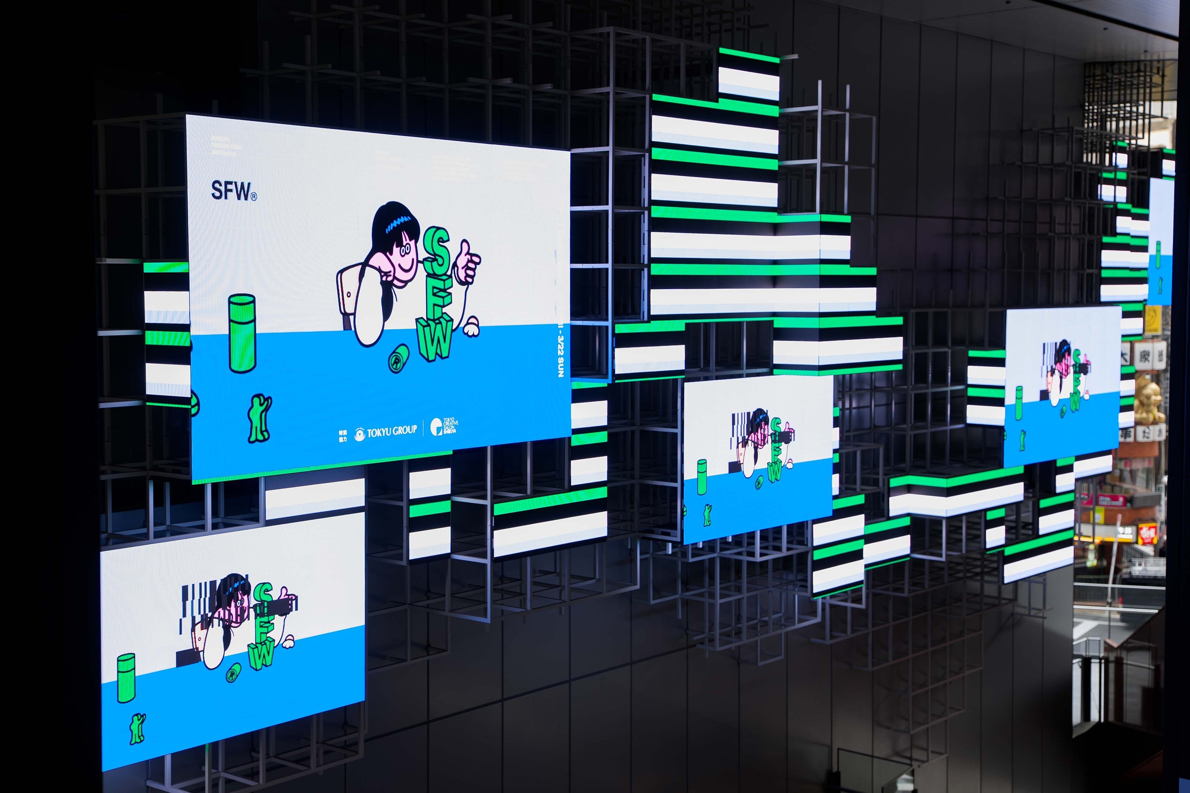 会期中、Face Okaさんによって渋谷ファッションウィークのために描き下ろしされた期間限定のアートが、渋谷の街の至るところに登場。「渋谷駅出入口21番エレベーター地上上屋壁面」には大型アートも出現、渋谷の街を彩り来街者をお迎えします。