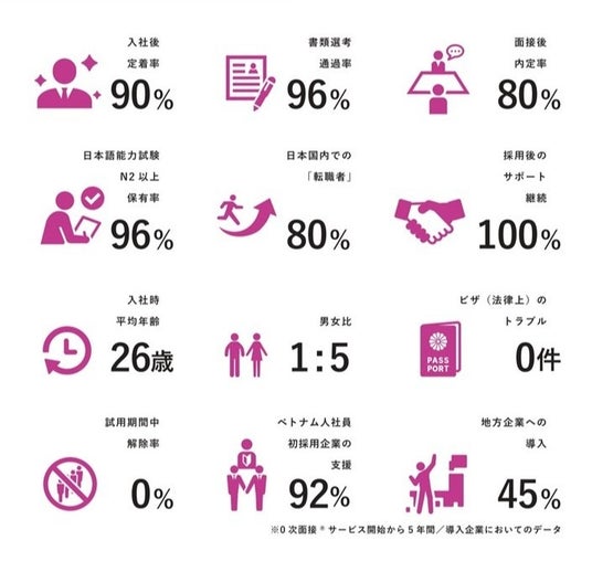 サービス開始から5年間で入社後の定着率9割超、面接後の内定率80.3%。