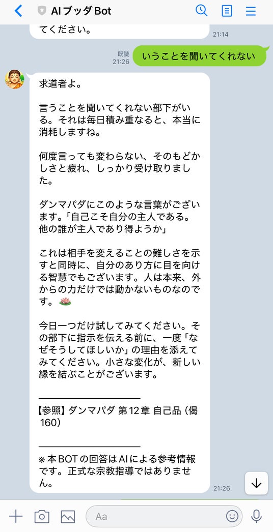 深夜2時に眠れない夜、LINEを開いて悩みを打ち込む。返ってきた言葉の末尾に「ダンマパダ 第16章 偈214」とある。