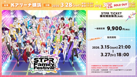 株式会社STPR(本社:東京都渋谷区、代表:柏原真人、以下「STPR」)は、当社所属の2.5次元アイドル・歌い手グループ「すとぷり」「Knight X - 騎士X -」「AMPTAKxCOLORS」「めておら - Meteorites -」「すにすて - SneakerStep Prod.STPR MUSIC」「とぅるりぷ - True&Lip Prod.STPR MUSIC」が出演する大型ライブイベント『STPR Family Festival!! 2026』(Kアリーナ横浜/2026年3月28日(土)・29日(日)開催)について、2026年3月15日(日)21:00より、チケットの「STPR TICKET機材開放販売(先着)」を開始したことをお知らせいたします。