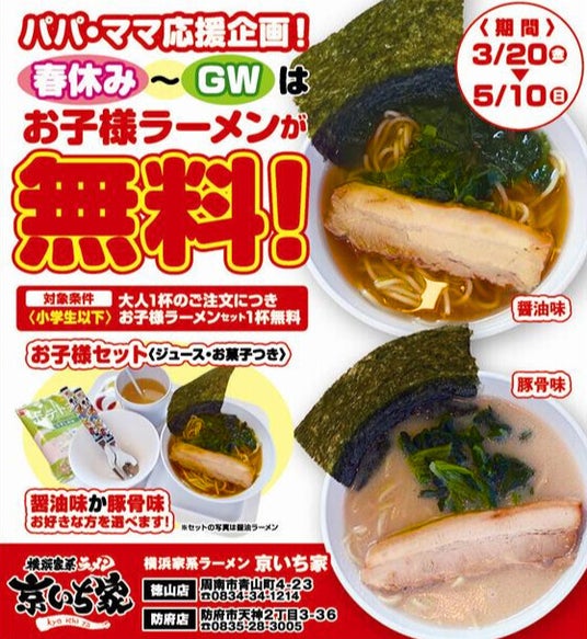 山口県内で本場仕込みの濃厚な味わいと活気を提供する横浜家系ラーメン 京いち家(https://kyoichiya.jp/html/)(運営:株式会社京瀧、代表取締役:京瀧 崇久)は、2026年3月20日(金・祝)から5月10日(日)までの期間、地域のご家族への感謝を込めた「パパ・ママ応援企画」を徳山店・防府店の両店舗にて実施いたします。