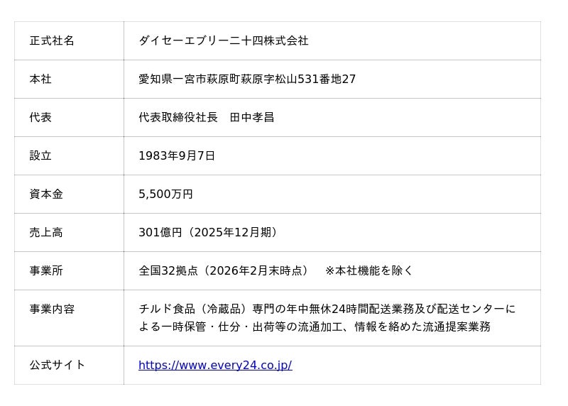 ダイセーエブリー二十四株式会社(本社:愛知県一宮市、代表取締役社長:田中孝昌、以下「当社」)は、岡山県岡山市に新たな物流拠点「岡山スーパーハブセンター」(以下「本センター」)を開設いたします。本センターは、2026年5月13日に稼働を予定しており、竣工式は4月28日に執り行う予定です。