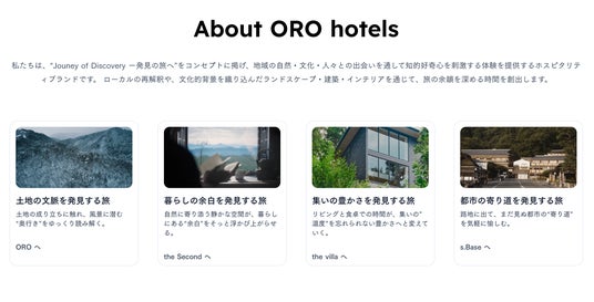 公式サイトでは、4つのブランドごとに異なるフィロソフィーや滞在価値を紹介し、「ORO hotels」が描く多様な"発見の旅"を分かりやすくお伝えします。