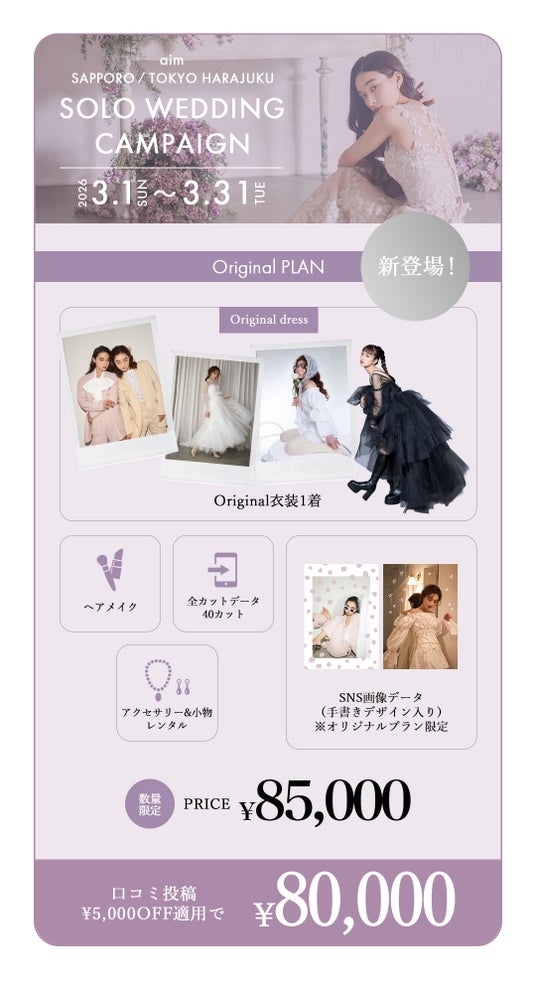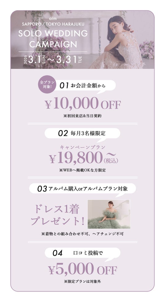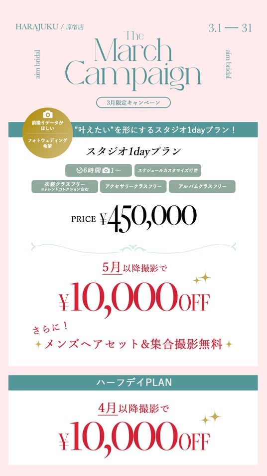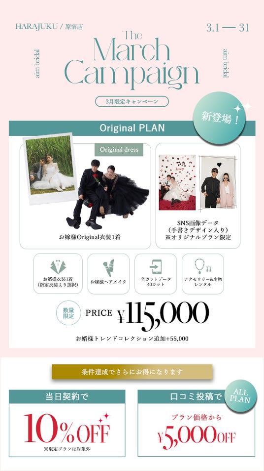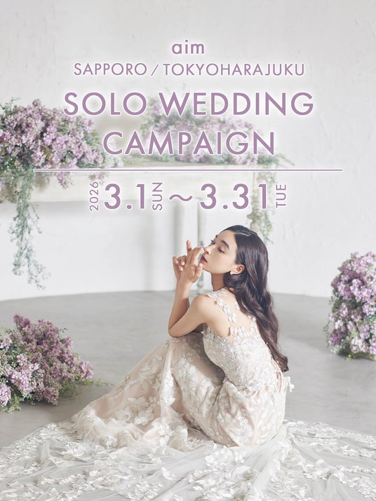 クリエイティブなコーディネート提案と圧倒的ビジュアルで人気のaim/aimme東京原宿店にて、お得に婚礼&ソロウェディング撮影が叶う3月限定キャンペーンを開催いたします。