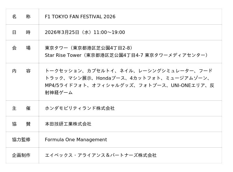 F1 TOKYO FAN FESTIVAL 2026実行委員会は、FIA(※1)フォーミュラ・ワン世界選手権(以下、F1(R))日本グランプリ(※2)公式プロモーションイベント「F1 TOKYO FAN FESTIVAL 2026」を開催します。当イベントは2026年3月25日(水)、東京タワーおよびStar Rise Tower(東京都 港区)で開催され、F1(R)マシン展示や体験型のF1(R)コンテンツ、トークショーといったステージプログラムなど、F1(R)ファンはもちろん、F1(R)を観たことのない方や、ご家族連れの方も楽しめるコンテンツを多数ご用意しています。
