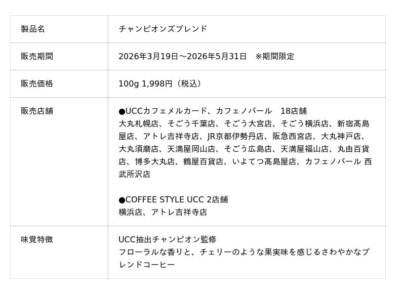 COFFEE STYLE UCC株式会社(本社/兵庫県神戸市、代表取締役/西本圭吾)は、「ジャパン ブリューワーズ カップ※1 2018」優勝、および世界大会でも準優勝の実績を持つ、UCCが誇るコーヒー抽出競技大会の日本チャンピオンである中井千香子(なかい ちかこ)が監修した『チャンピオンズブレンド』を、3月19日(木)に、UCCグループ直営のコーヒー豆挽き売り業態「UCCカフェメルカード」など全国20店舗にて期間限定で発売します。