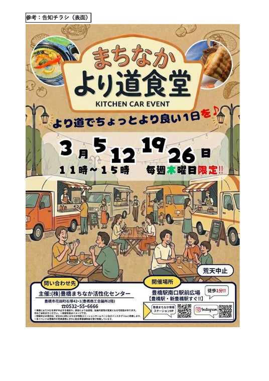 豊橋駅南口駅前広場で2026年3月の木曜に開催されている「まちなか より道食堂」。あたたかな春の陽気のもとで、キッチンカーグルメを楽しみませんか?ランチメニューのほか、コーヒーやスイーツもありますよ♪