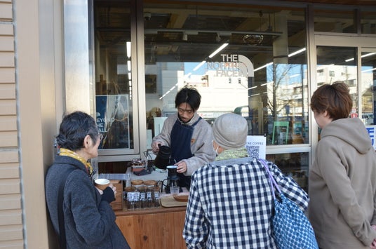 2月の土曜(21日・28日)及び3月1日の日曜には、萱町通りのアウトドアショップ「モンタニア」の敷地内に、コーヒー専門店「SACAE COFFEE」が特別出店。6種類の豆から選べる挽きたてのコーヒーが提供され、訪れた人たちは豊かな香りと店主との会話を楽しんでいました!香りで豆の違いを比べられるよう粉を入れた瓶も置かれ、「五感で楽しめる専門店」(店主)を満喫しました。