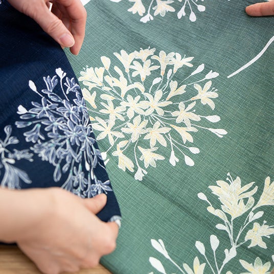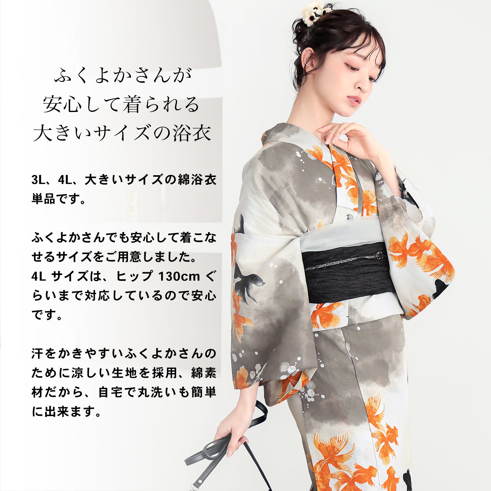 素材は綿100%、変わり紅梅織りのしっかりした生地です。ざっくりとした麻のような触り心地が特徴で、夏の暑い時期にも肌につかず涼し気に着こなせます。S/F/TL/LLに加え、3L/4Lも取りそろえた豊富なサイズ展開もうれしいポイント。低身長さんやふくよかさんなどフリーサイズの浴衣では合わない方にも着こなしていただけます。