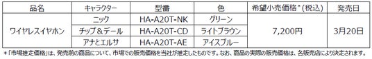 本モデルは、Victorブランドより発売中の完全ワイヤレスイヤホン「HA-A20T」をベースに、イヤホン本体と充電ケース、パッケージに、「ニック」、「チップ&デール」、「アナとエルサ」をデザインしました。また、同企画で好評を得たキャラクターボイスを搭載。電源ON/OFFと、ワイヤレス接続/切断をする際に、それぞれのキャラクターボイスでお知らせします。