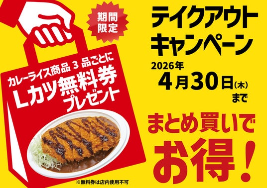 株式会社チャンピオンカレー(本社:石川県野々市市、代表取締役社長:南 恵太)は、テイクアウト利用の促進を目的としたキャンペーンとして、2026年3月23日(月)から4月30日(木)までの期間、テイクアウトでカレーメニューを3品ご注文いただいたお客様に次回のテイクアウトで使える「Lカツカレー無料券」を1枚プレゼントするキャンペーンを実施いたします。