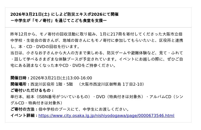 大阪市内のイベントで「モノ寄付」物品回収を実施します -読まなくなった本やCD・DVDでこども食堂を支援-