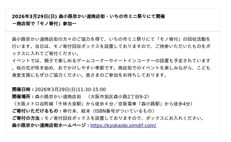 こども食堂の支援を通じて、誰も取りこぼさない社会の実現を目指す「認定NPO法人全国こども食堂支援センター・むすびえ(以下、むすびえ)」(東京都渋谷区、理事長:三島理恵)は、春の新生活・お引越しシーズンに合わせて、読まなくなった本やCD・DVD、使わなくなったアクセサリーや楽器など趣味の品等を通じて寄付をする「春のモノ寄付キャンペーン」の実施に伴い、大阪市内のイベントにて読まなくなった本やCD・DVDの回収活動を実施いたします。