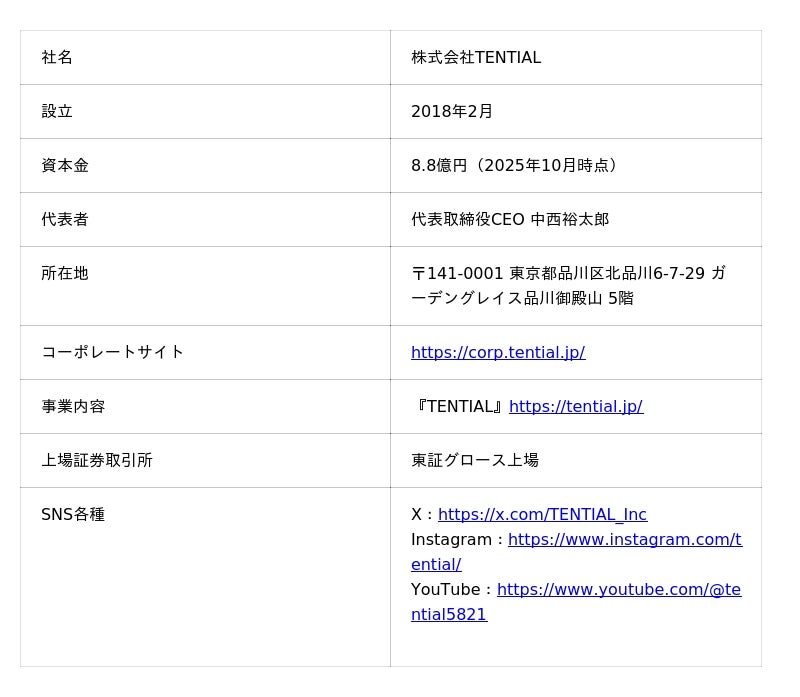 株式会社TENTIALは、「健康に前向きな社会を創り、人類のポテンシャルを引き出す。」をミッションに掲げ、コンディショニングブランド『TENTIAL』を運営しています 。代表取締役CEO中西裕太郎は、プロサッカー選手を目指した高校時代に病気で夢を絶たれた原体験から、自身のポテンシャルを最大限に発揮するためには健康と日々のコンディショニングが不可欠であると痛感。この経験から株式会社TENTIALを創業し、世の中に「コンディショニングを実装する」ことを目指しています。コンディショニングブランド『TENTIAL』は、アスリートの知見と最新技術・研究に基づき、機能性を追求した製品・サービスを提供。24時間365日、日常生活のあらゆるシーンで心身を整え、疲労回復やパフォーマンス向上をサポートするコンディショニング活動を推進しています 。すべては個人のコンディションとポテンシャルを引き出すという信念のもと、株式会社TENTIALは、健康に前向きな社会の実現のため、コンディショニングの社会実装に取り組んでまいります。