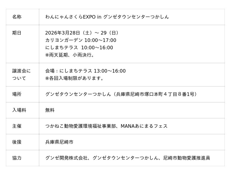 グンゼ株式会社の連結子会社、グンゼ開発株式会社が運営する商業施設グンゼタウンセンターつかしんは、2026年3月28日(土)、29日(日)の2日間、保護動物の譲渡会や防災をテーマにした啓発イベント「わんにゃんさくらEXPO in グンゼタウンセンターつかしん」に協賛し、会場を提供することをお知らせします。
