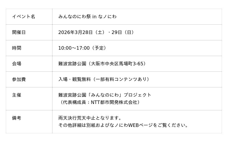 『難波宮跡公園「みんなのにわ」プロジェクト』(代表構成員:NTT都市開発株式会社)は、難波宮跡公園(大阪市中央区)において、開園1周年を記念したイベント「みんなのにわ祭 in なノにわ」を、2026年3月28日(土)・29日(日)の2日間にわたり開催します。