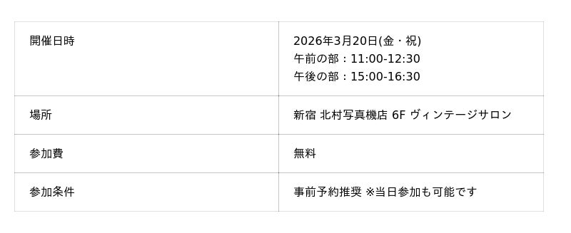 株式会社カメラのキタムラ(本社:東京都新宿区、代表取締役社長執行役員:山崎 智彦)が運営する新宿 北村写真機店では、2026年3月20日(金・祝)にプロカメラマン斎藤 巧一郎氏によるライカプロカメラマンセミナーを開催します。今回は「ライカ M EV1 魅力と活用術」をテーマに2025年11月1日に発売されたばかりのM型ライカボディ「M EV1」についてレクチャーを実施します。