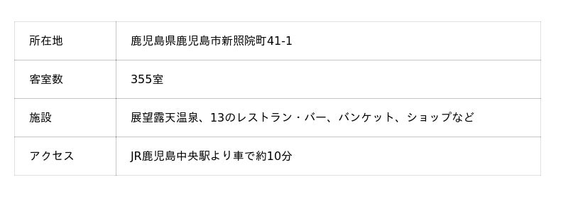 当ホテルは、桜島と鹿児島市街地を一望する絶景と、地下1,000mから湧き出る天然温泉「さつま乃湯」を最大の魅力としています。また、地元の豊かな食材を活かした多彩なレストランを展開し、上質な食体験を提供しております。