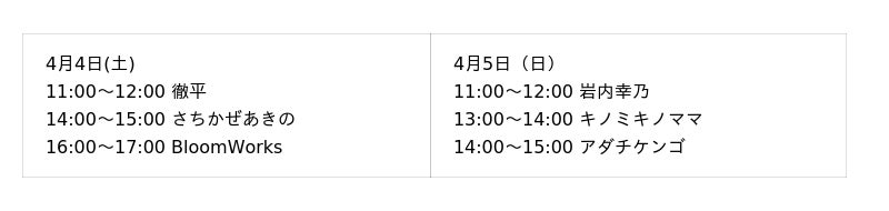 <開催日時>4月19日(日) 12:30~13:30頃