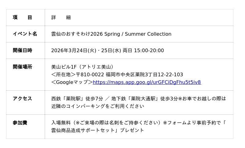 一般社団法人 雲仙観光局(以下、弊局)は、飲食店のシェフやバイヤーはじめとする食のプロフェッショナルに向けた商談・エキシビジョンイベント『雲仙のおすそわけ2026 Spring / Summer Collection』を、2026年3月24日(火)・25日(水)の2日間、福岡市中央区薬院(アトリエ美山)にて開催いたします。