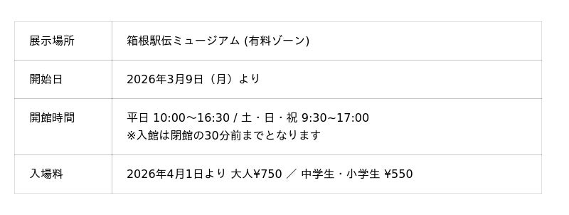 レビ系、2026年秋放送予定)を記念した特別展示を開催しています。本展示では、実際の原稿や作品誕生の背景のほか、普段は知ることのできない箱根駅伝を伝えるテレビ局側の制作ストーリーなども紹介し、箱根駅伝を新たな視点からお楽しみいただけます。ミュージアムショップでは、原作小説の書籍販売も行っています。なお、箱根駅伝ミュージアムでは、展示内容の充実と施設サービス向上のため、2026年4月1日(水)より入館料金を改定いたします。今後も箱根駅伝の魅力をより多くの方に発信できる展示の充実に努めてまいります。