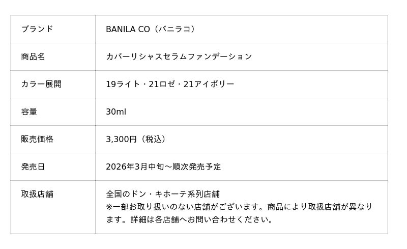 「BANILA CO」は全国のドン・キホーテ系列店舗にて、新商品「カバーリシャスセラムファンデーション」を先行販売開始します。