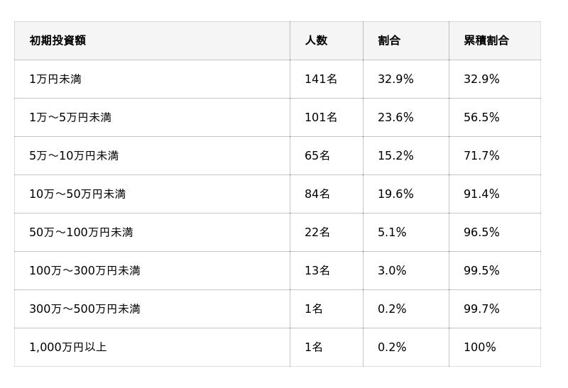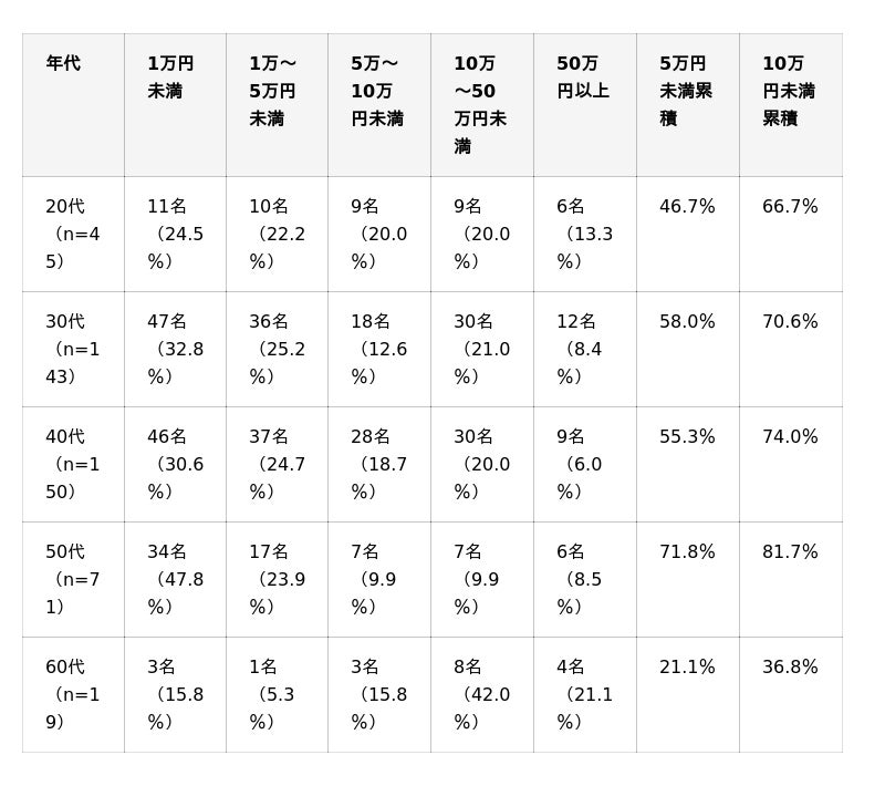 20代(46.7%)・30代(58.0%)・40代(55.3%)はいずれも5万円未満の累積が半数前後で、少額スタートが標準的であることがわかります。