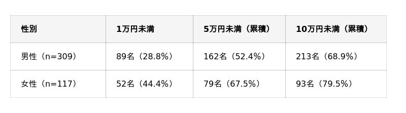 性別で初期投資額を見ると、男性(n=309)では「1万円未満」が28.8%、5万円未満の累積が52.4%、10万円未満の累積が68.9%でした。一方、女性(n=117)では「1万円未満」が44.4%と男性より15.6ポイント高く、5万円未満の累積は67.5%、10万円未満の累積は79.5%となりました。