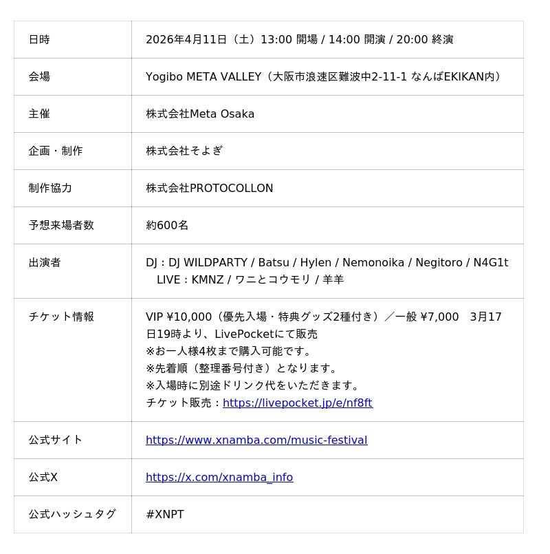 デジタル空間やeスポーツを活用して地域課題を解決する株式会社Meta Osaka(所在地:大阪府大阪市、代表取締役:毛利英昭)は、2026年4月11日(土)、大阪・難波のライブハウス「Yogibo META VALLEY」(所在地:大阪市浪速区)にて、バーチャルシーンに関わりのあるDJ・トラックメイカーとバーチャルアーティスト(VTuber)が共演する新感覚クラブイベント「XNAMBA PARTY(エックスナンバ・パーティー)」を開催します。