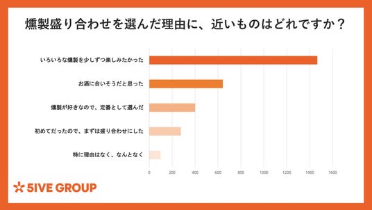 本アンケートでは「食べ比べ」に関する設問も実施しました。結果、さまざまな燻製を少しずつ楽しみたいというニーズが見られ、燻製の盛り合わせを選んだ理由としては、「食材ごとの味の違いを楽しめる点」が最も多く、あわせて「お酒に合いそう」といった理由も多く挙げられました。