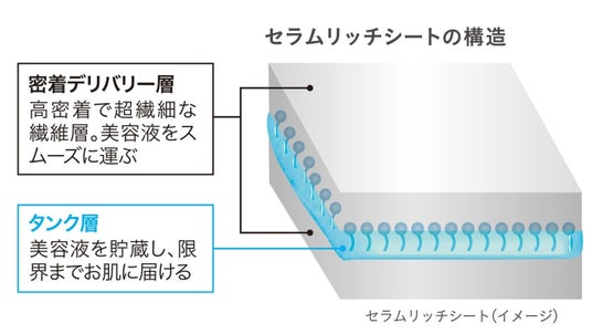 大容量シートマスクでありながら、シートの厚さや柔らかさだけでなく、高い密着性と多くの美容液を抱えられる保液性、そして肌へと成分をリリースするデリバリー力の高さまでとことん追求して設計した「セラムリッチシート」。肌当たりの柔らかい3層構造の高*⁷浸透*¹⁰・高密着*⁷シートは、これまでのシートよりも厚みが110%*⁹に、密着力はなんと137%*⁹にUPしております。さらに、シート1枚あたりの美容液含浸可能量も117%*¹¹にUPし、美容液を保持しながら、スムーズにお肌に運ぶ機能性を誇り、お肌に限界まで美容液を届けます。