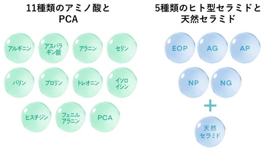 肌を構成するうるおい成分である11種類のアミノ酸*³、PCA*⁴、6種類のセラミド*⁵の配合量をUPし、さらに、高濃度ナイアシンアミド*⁸とガラクトミセス培養液*⁸も配合。肌に元々存在する保湿成分を補うことで、高い保湿効果と高い浸透性で肌本来が持つ潤いやバリア機能にアプローチします。