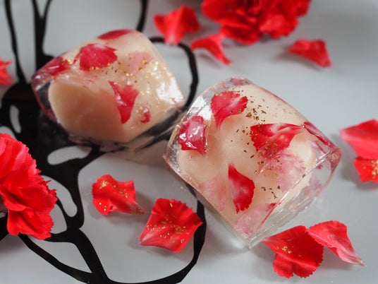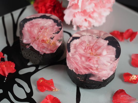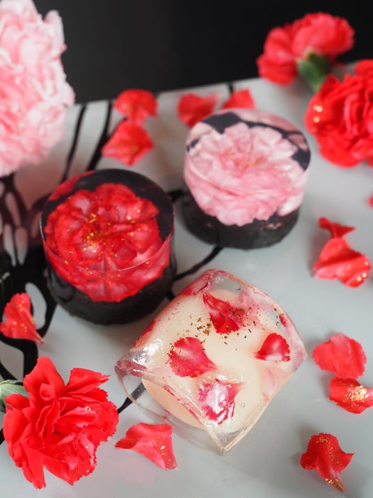 透明な錦玉羹に、豊橋産カーネーションを一輪ずつ咲かせるように閉じ込めました。