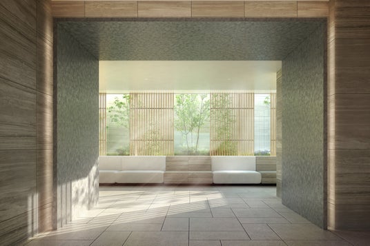 エントランスには、寺社建築を想起させる特徴的なデザインの庇を設けたほか、ラウンジへと続く動線には川の流れのように景色の移ろう植栽を計画し、日々の暮らしに彩りをもたらす設計にしました。エントランスホールは、柔らかく奥行きを感じさせる光の演出により、都市にありながら安らぎを享受できる空間を創出します。