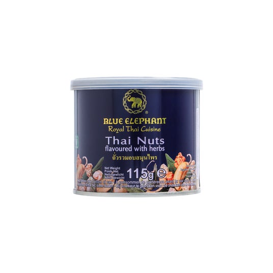 タイナッツとは、BLUE ELEPHANTのマスターシェフ・ヌーロウのオリジナルレシピにより、落花生やカシューナッツを中心に大胆な歯ごたえを演出し、カフィアライムやレモングラスなどのハーブで香りを付けたスナックです。ライスクラッカーやグリーンピース、白ゴマなども入っており、1粒ずつ味わっても美味しく、まとめて食べるとハーブやスパイスが混ざり合った複雑な味を楽しめる逸品です。小腹がすいたときのおやつや、炭酸飲料やアルコールにも合うので、おつまみとしてもお召し上がりいただけます。