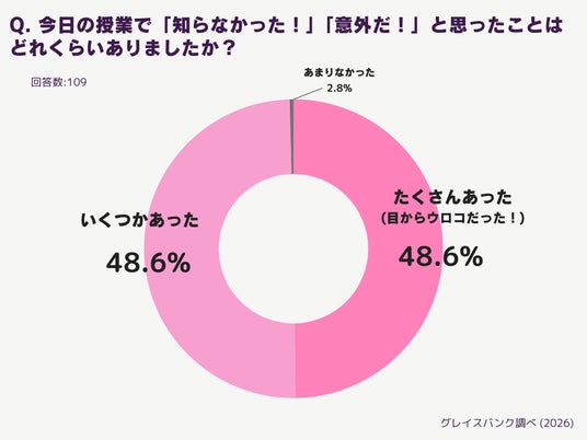 授業後のアンケート結果からは、本授業を通して「初めて知ること」や「意外だったこと」が多かったようで、講義の中で一番印象に残ったことや感想を書く欄でも、たくさんのコメントをいただきました。