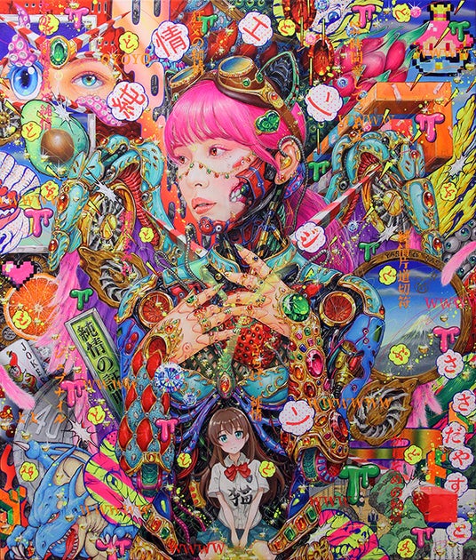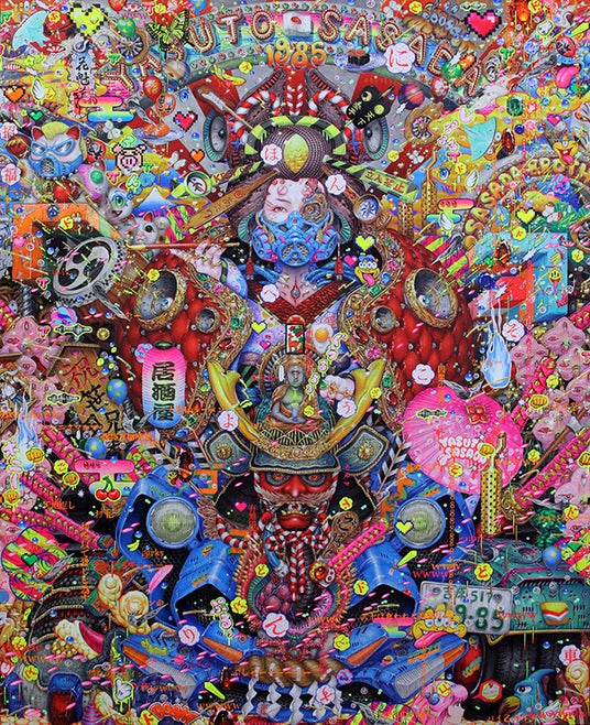 今回の個展『OVERLOAD』では、僕自身の脳内に溢れ出すイメージと、現代社会が抱える情報の濁流をキャンバスに叩きつけた結果出来上がった作品を展示しています。新作『花魁道中』をはじめとする作品群は、どれも視覚の限界に挑むような密度で描き込みました。