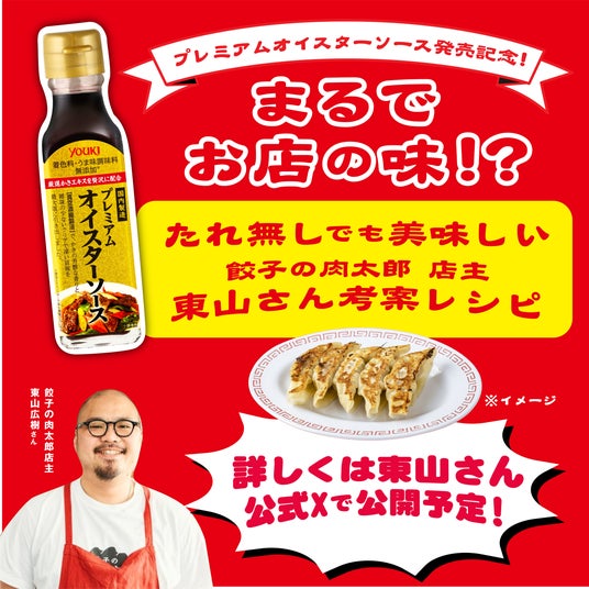 本キャンペーンと連動し、餃子専門店「餃子の肉太郎」店主・東山さんのX(https://x.com/h_gashiyama)アカウントにて、今年3月に発売したユウキ食品「プレミアムオイスターソース」を使用した餃子レシピのタイアップ投稿を実施いたします。本投稿では、「まるでお店の味」をテーマに、家庭でも再現しやすい餃子レシピを紹介。プレミアムオイスターソースを活用することで、肉の旨みを引き立てたコクのある味わいを実現します。