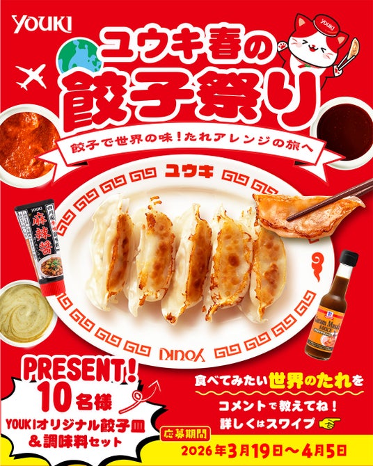世界各国の調味料や食材を幅広く取り扱うユウキ食品株式会社(本社:東京都調布市富士見町1-2-2、代表取締役社長:田中秀和)は、公式InstagramおよびXにて、春の餃子祭り~餃子で世界の味!たれアレンジの旅へ~キャンペーンを実施いたします。