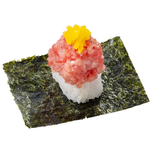 提供メニューは、「生本鮪赤身(1貫)100円(税込110円)」「生本鮪中とろ(2貫)280円(税込308円)」「生本鮪大とろ(1貫)280円(税込308円)」「生本鮪中落(ミニ丼)300円(税込330円)」「トロたくのり包み 200円(税込220円)」。いずれも解体したまぐろを使用した限定商品です。