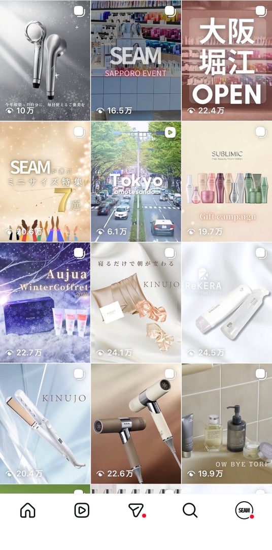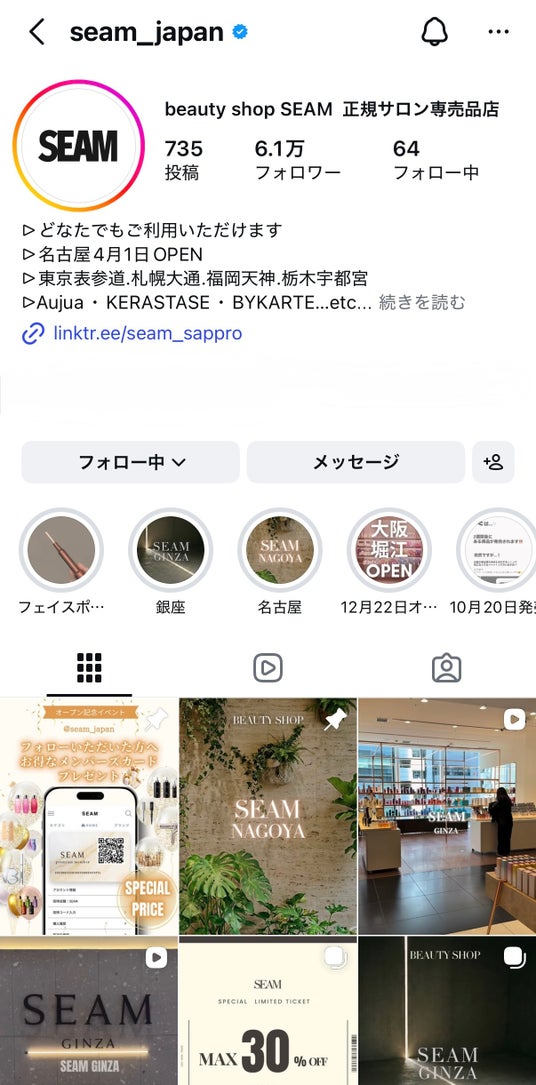 SEAMの情報発信基盤としては、当社運用の公式Instagramアカウント「@seam_japan」のプロフィール画面上で、フォロワー数約6.1万人、投稿数735件が表示されています。