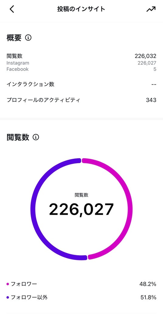 投稿一覧画面では、店舗告知・商品紹介・キャンペーン投稿など複数投稿において10万~24万台の閲覧表示が確認され、個別投稿のインサイト画面では22.6万閲覧、閲覧の51.8%が非フォロワー、プロフィールのアクティビティ343が確認されています。