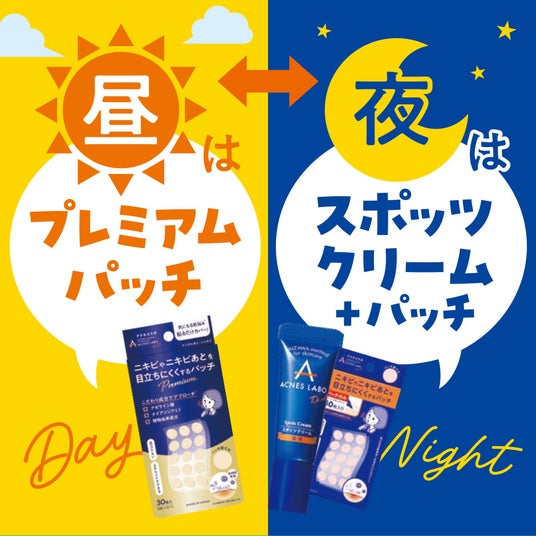 新商品のプレミアムポイントパッチと、定番のスポッツクリームを、昼夜のサイクルで使い分けることで、お肌に寄り添い、理想の素肌づくりをお手伝いします。